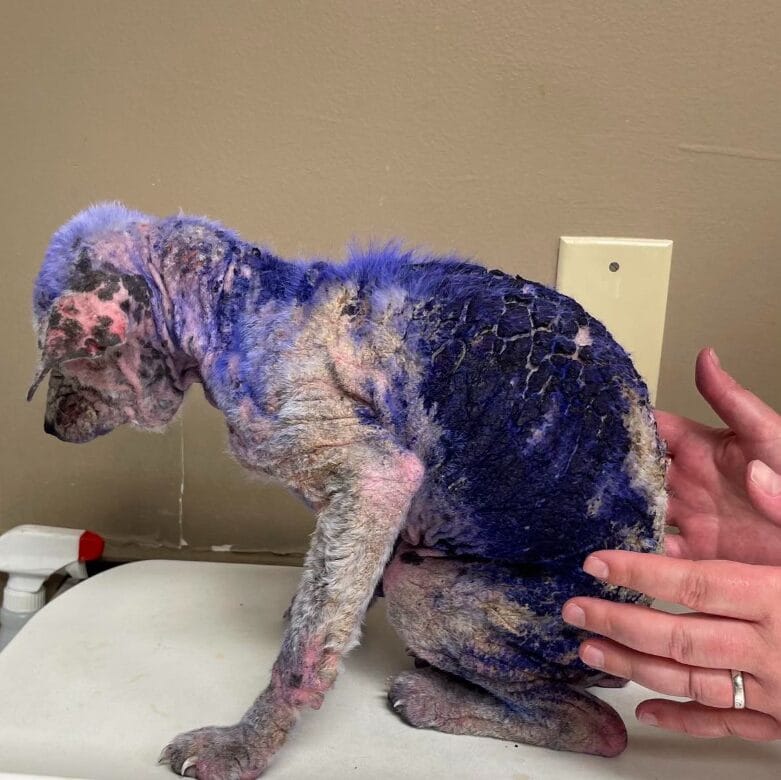 She was rushed to a veterinary hospital, where doctors began treating her life-threatening condition. Staff quickly noticed that the dog was covered in a strange purple color, and at first, no one knew what it was.