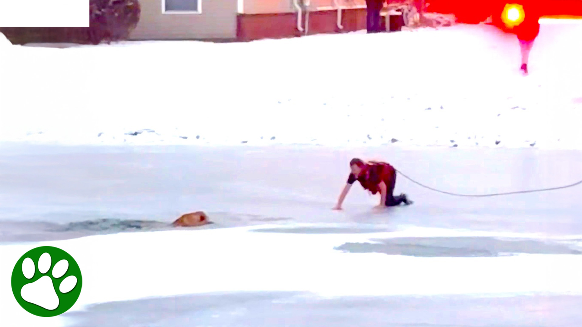 A pup falls through the ice and can barely hold on as a brave man crawls across the cracking surface to reach him. He manages to pull the exhausted dog to safety and guide him back to shore. The pup is finally reunited with his worried owner in a touching moment. This heartwarming rescue shows true bravery and compassion ❤️🙏