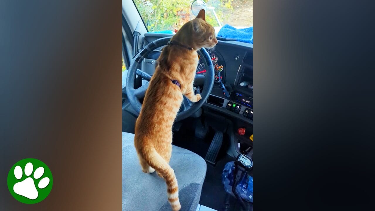 Cat rescued at a truckstop takes the wheel He definitely belongs in this truck 😻 @odiethetruckingcat