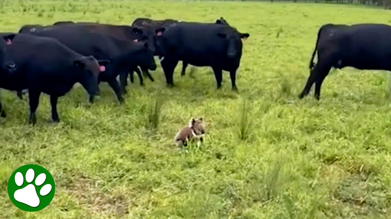 The terrified little koala looks just as confused as the cows. Thanks for helping him out of there quickly and gently ❤️