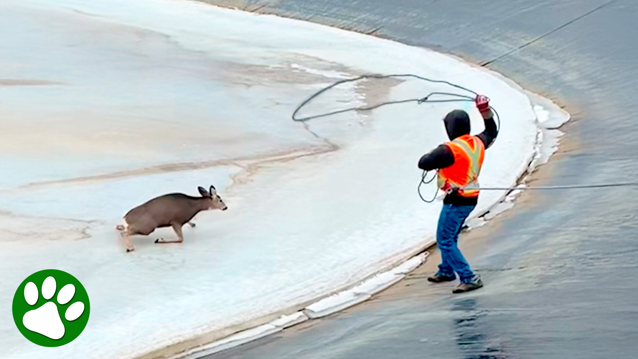 A deer trapped on a frozen pond was spotted by these kindhearted workers. They immediately decide to help the poor animals, and form a plan. With one skilful throw, one of the workers catches the deer with a lasso, and can pull her to safety.