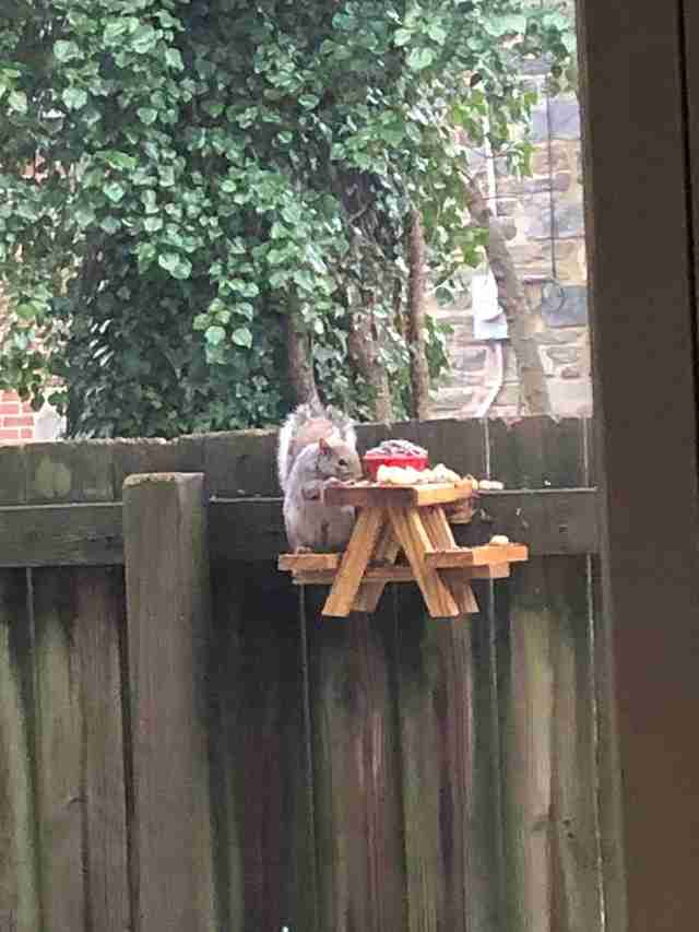 The wildlife lover really enjoys watching these furry friends getting busy in his back yard and wanted them to know it. Using some spare wood he had lying around at home he crafted a tiny picnic table and nailed it to his fence.